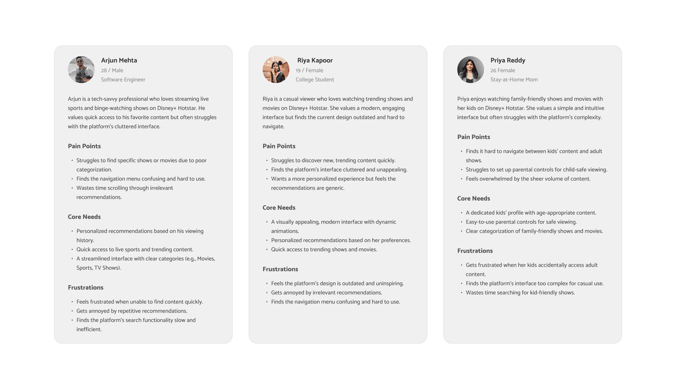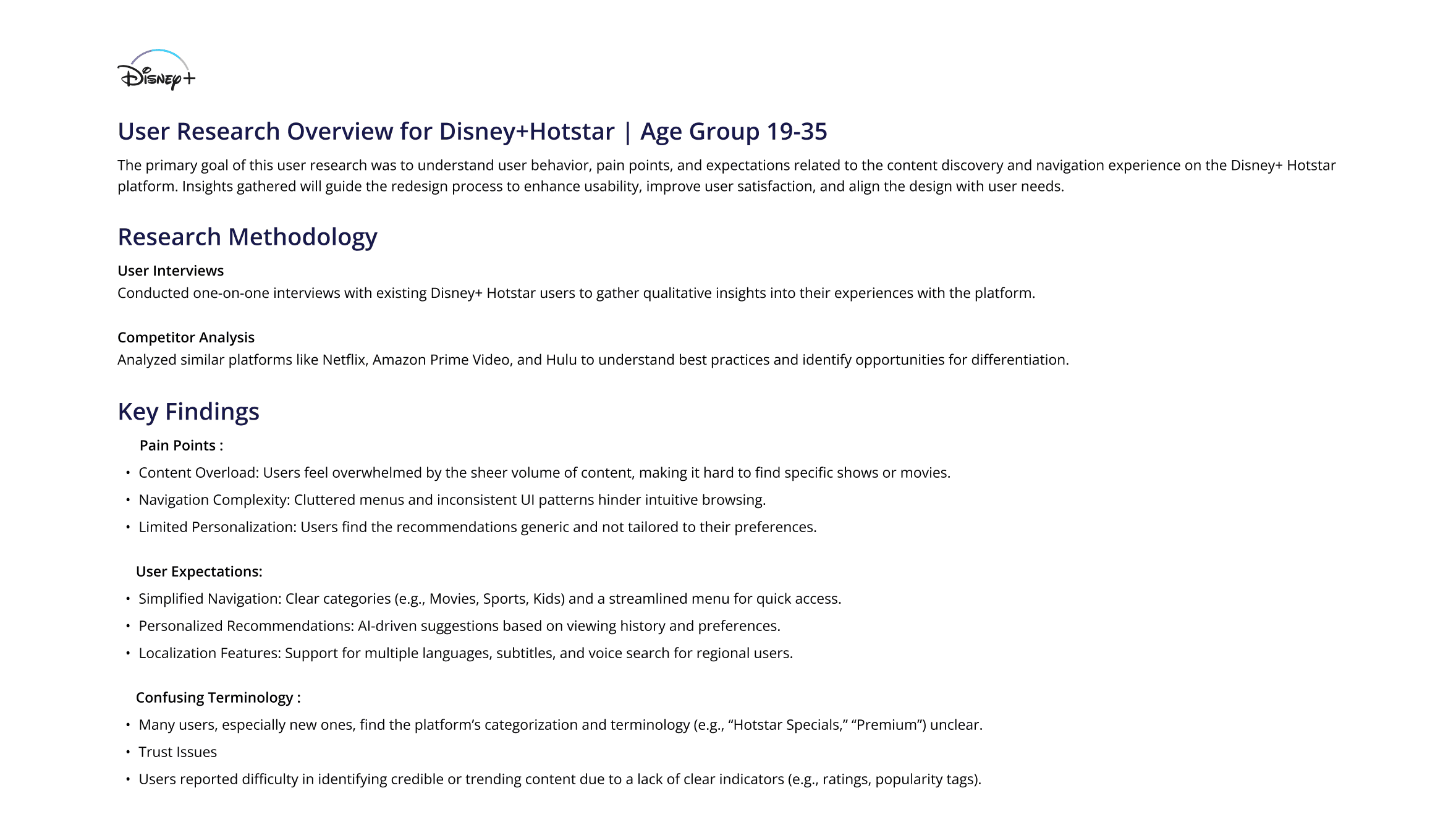 In this project, I followed a structured design process to revamp Disney+ Hotstar’s UI and deliver a visually captivating, brand-aligned experience. Here’s how I approached it