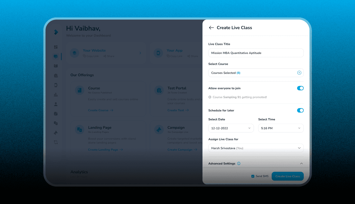 Tutors can create live classes to promote their courses or offer free sessions using this interface. They can schedule classes, enable โAllow everyone to joinโ for broader access, and send reminders to students. This feature helps tutors engage students and expand their audience.
