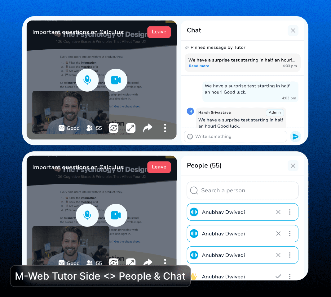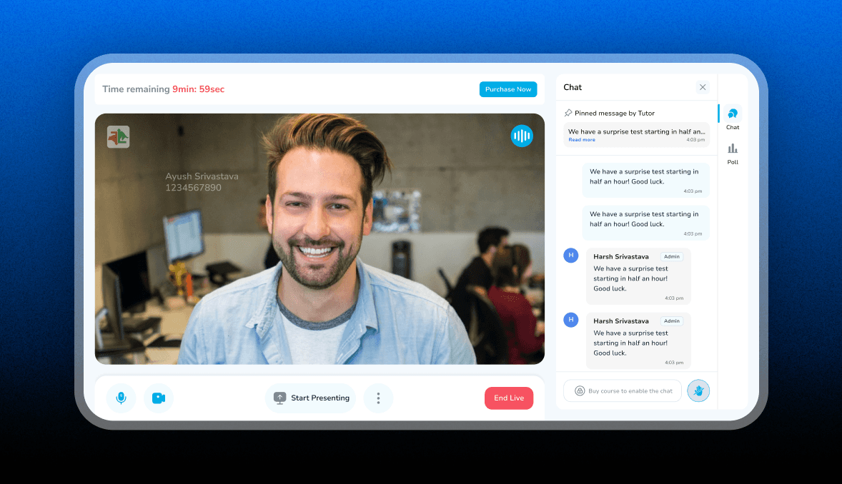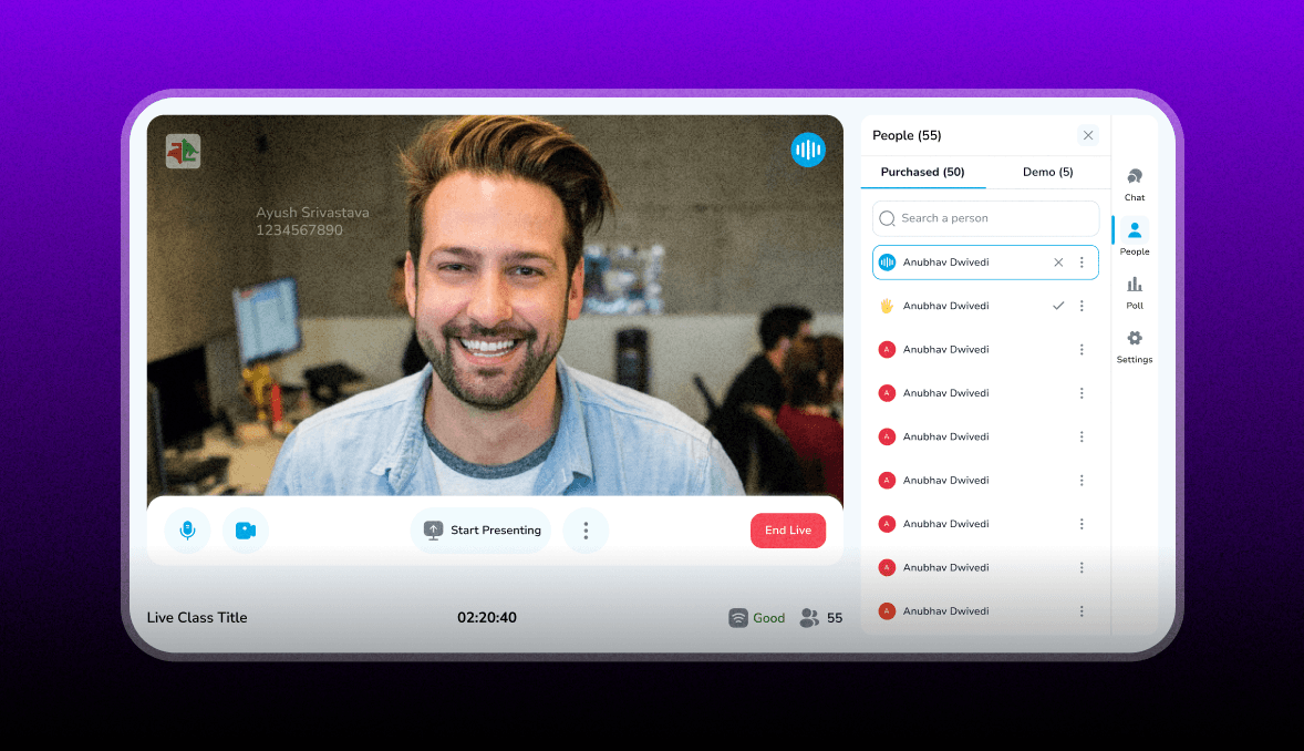 Tutors can view students who purchased the course and demo students who joined via a link. The interface shows live attendance (e.g., 55 students) and allows tutors to start/end presenting. This helps tutors track engagement and manage live classes effectively, he can also block students by tapping on "3 Dots"