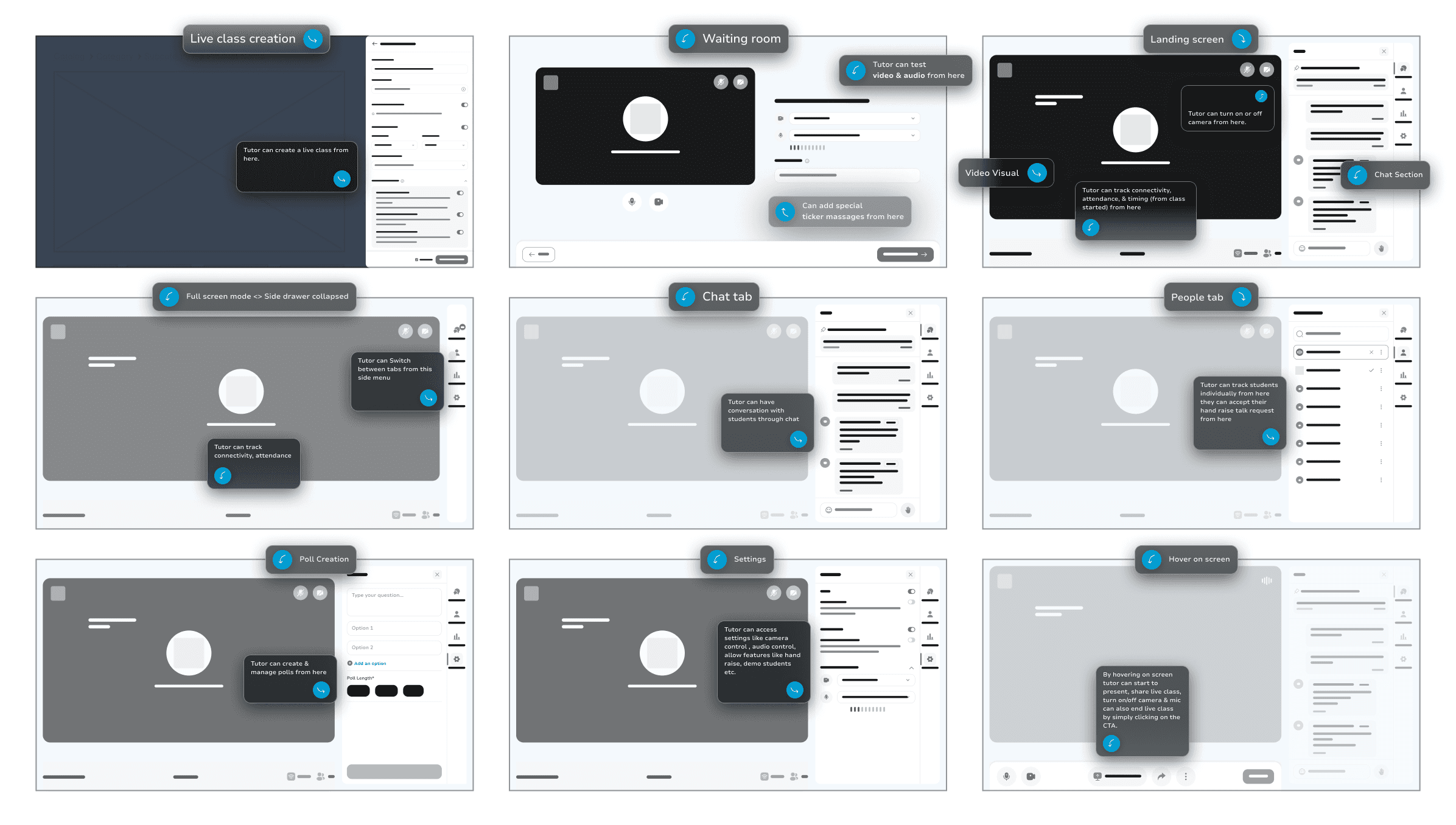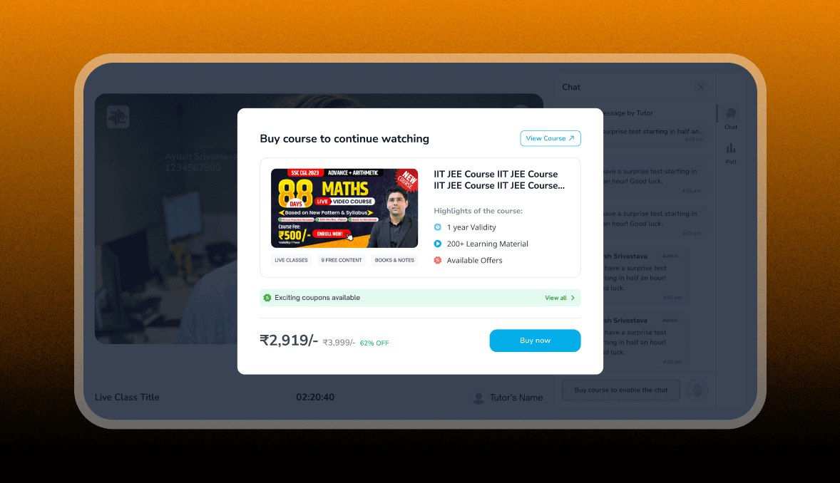 Develop a streamlined, engaging learning platform that boosts tutor control and student interaction through integrated chat, polling, automated attendance, seamless live class sharing, intuitive scheduling, and limited-time course promotions for new users.