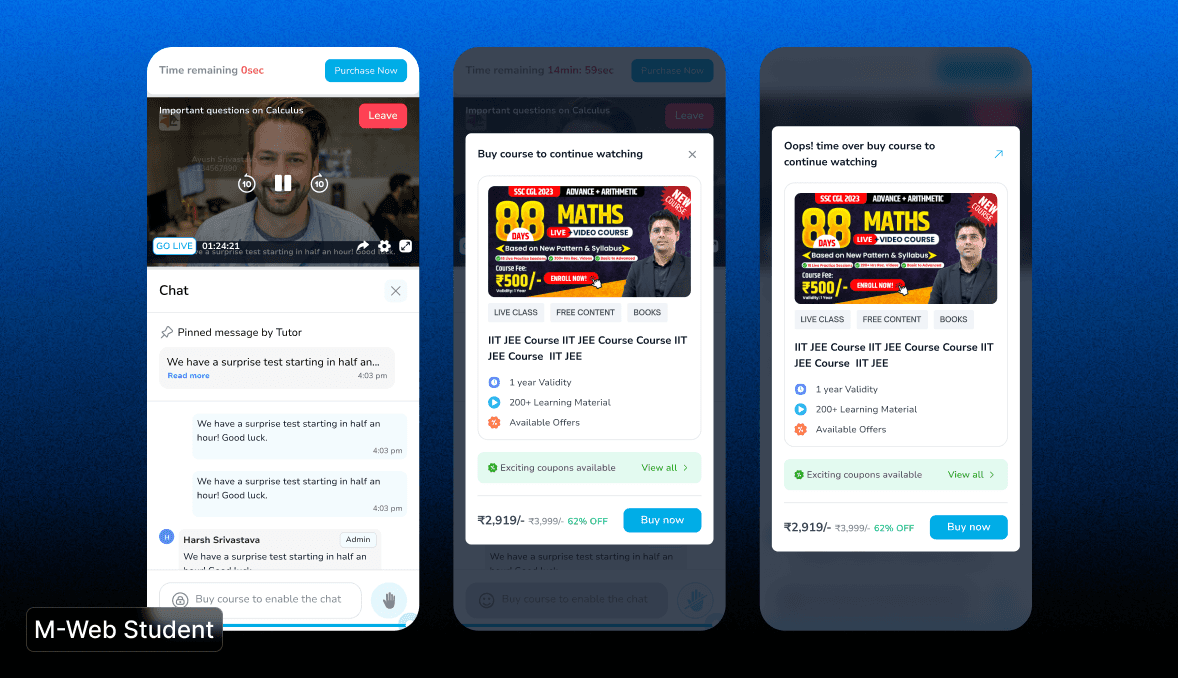Sharable live class feature where any students can join the live class for a specific time after that system can pitch course purchase to continue the class.