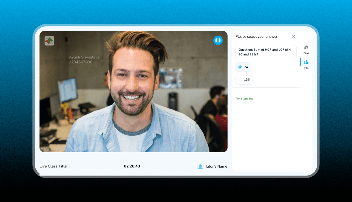 The Poll feature allows learners to participate in interactive quizzes or questions during a live class. When a poll is active, students can see the question and available options on the right panel. They can select their answer before the timer runs out, and their response is submitted automatically. A countdown timer indicates the remaining time to answer. This feature helps engage students, assess their understanding, and make learning more interactive.