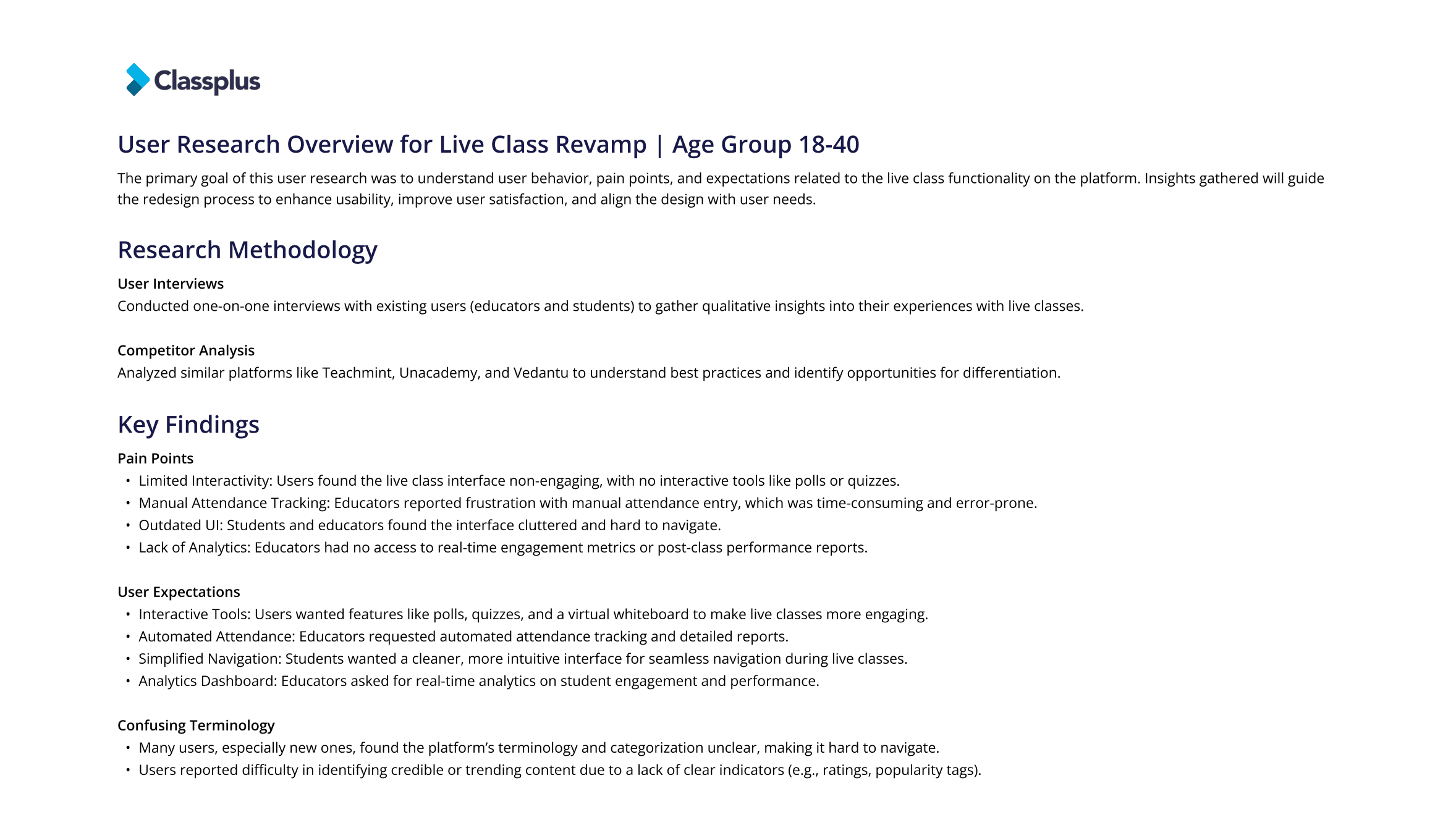 Classplus is an edtech platform designed to help educators and coaching institutes manage online classes, including live sessions, course distribution, and student engagement. This analysis evaluates the old designโs live class features against competitors to identify gaps and opportunities for improvement.