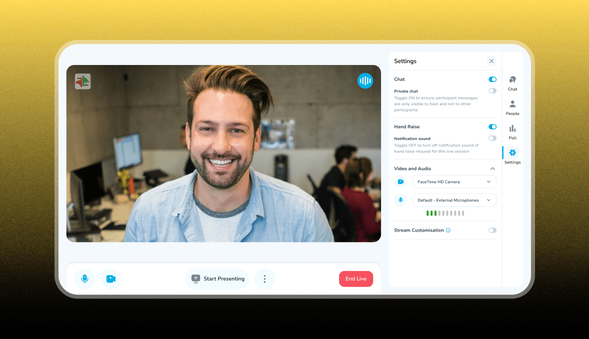 The Settings tab allows users to manage chat preferences, hand raise notifications, video and audio inputs, and stream customization options for a smooth live session experience.