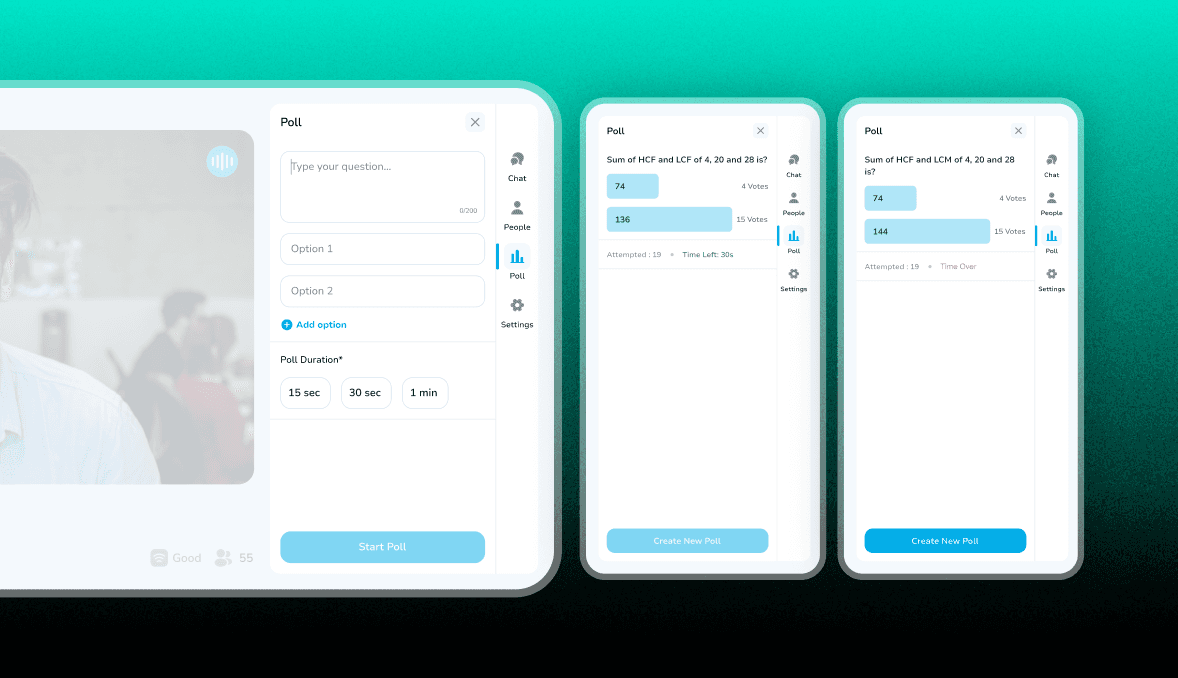 The Poll feature allows hosts to create interactive questions for participants. Users can enter a question, add multiple-choice options, and set a poll duration (15 sec, 30 sec, or 1 min). Once started, participants can vote in real time. Results are displayed dynamically, showing votes and remaining time. After completion, the host can create a new poll for continued engagement.