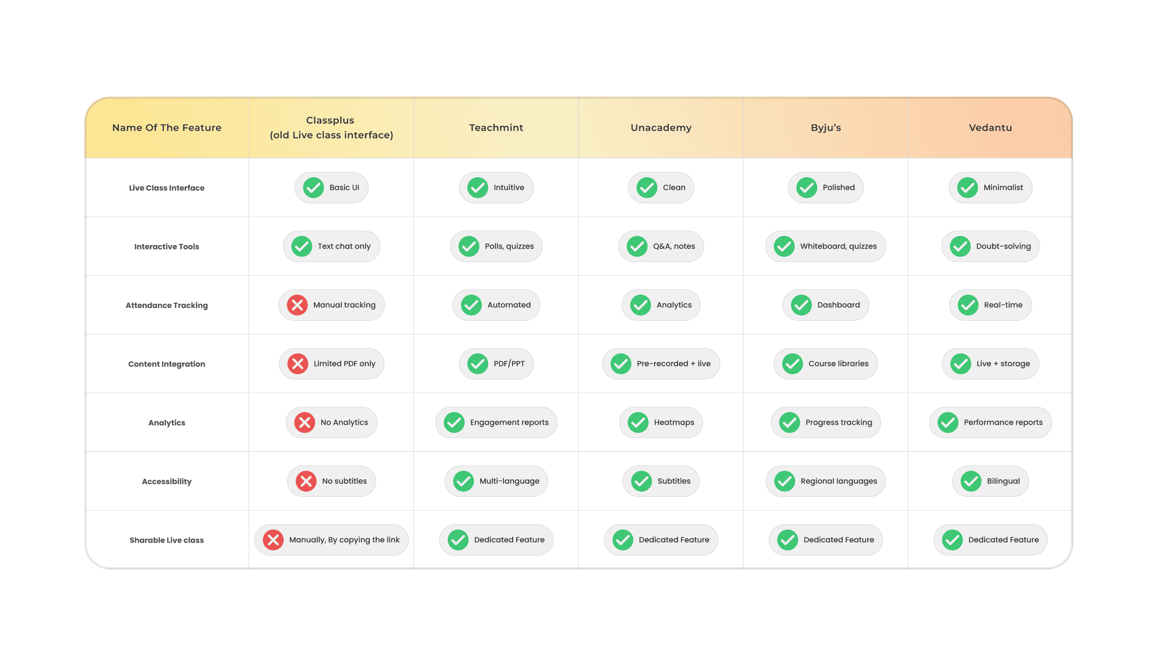 Attendance Tracking: Competitors automated this, while Classplus relied on manual entry