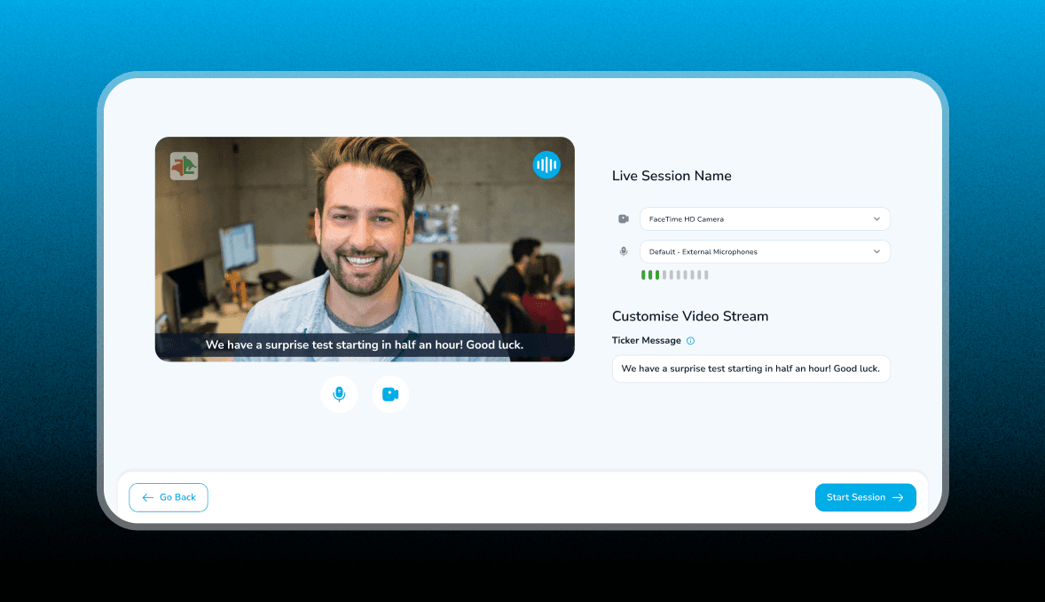 When tutor clicks on Go Live, we will show a preview screen to setup their video and audio also tutor can add ticker message as well.