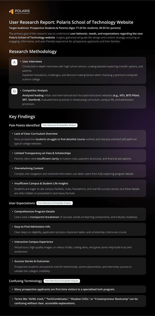 The primary objective of the website design for Polaris School of Technology was to create an engaging, intuitive digital platform that clearly communicates the institutionโs unique value proposition. Specific goals included: