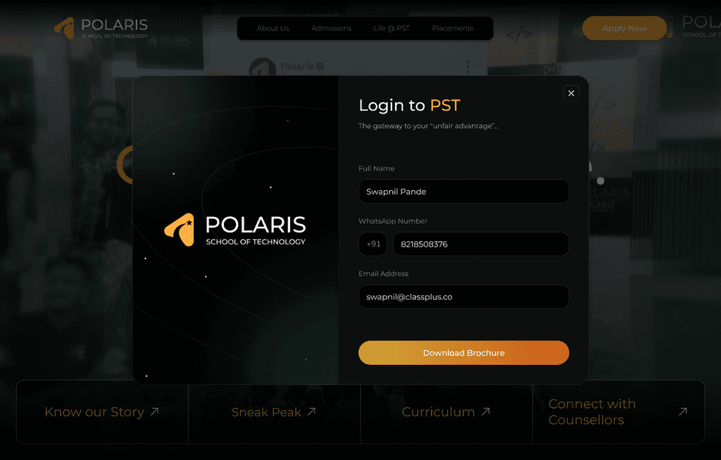 In November 2023, Classplus expanded into education with Polaris School of Technologyโa premium computer science college that bridges traditional learning with industry-ready skills. I designed a sleek, user-friendly website that highlights its innovative curriculum, immersive campus life, and exclusive admission process, positioning PST as Indiaโs top alternative for tech education.