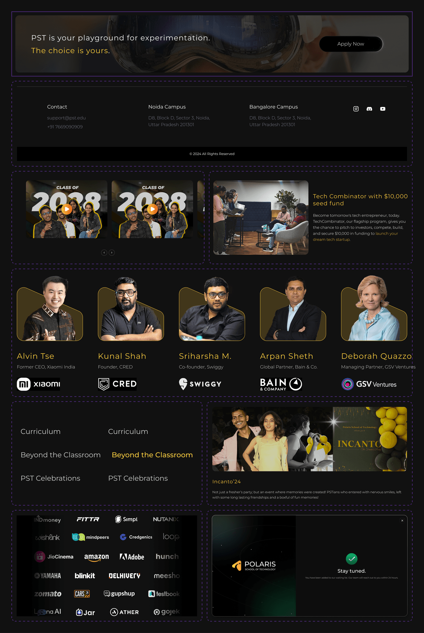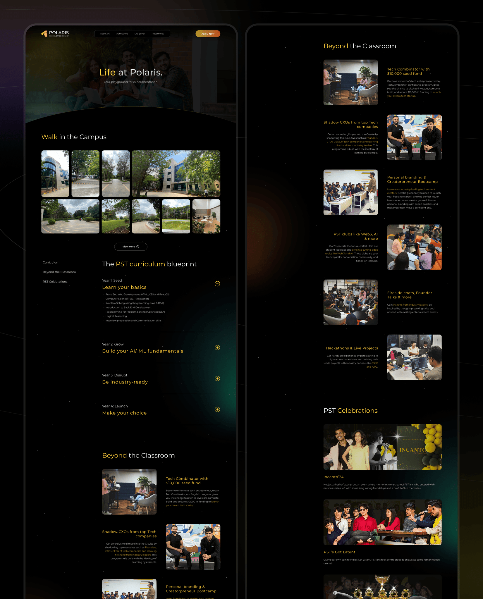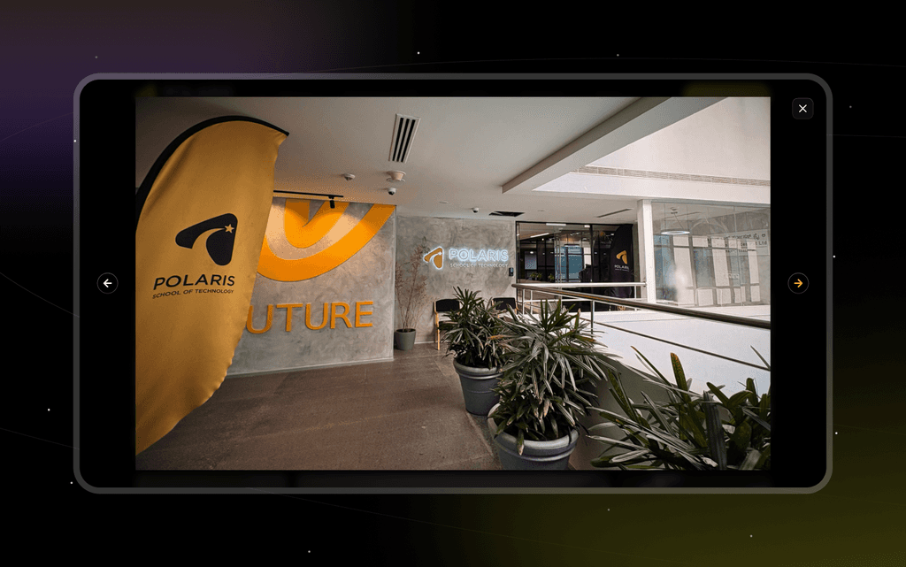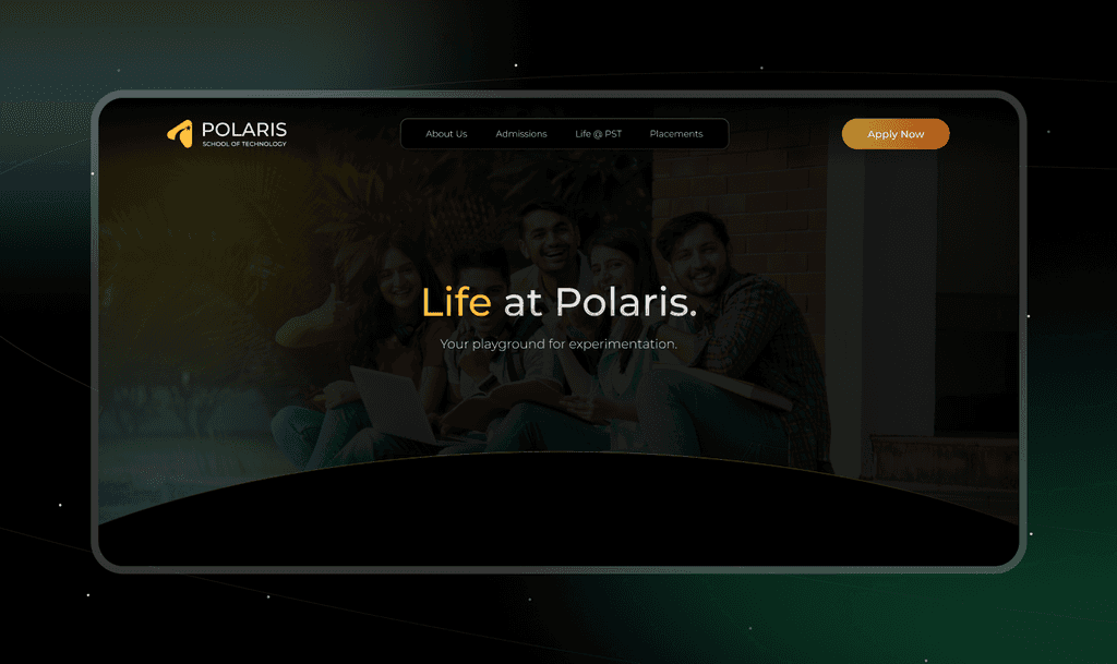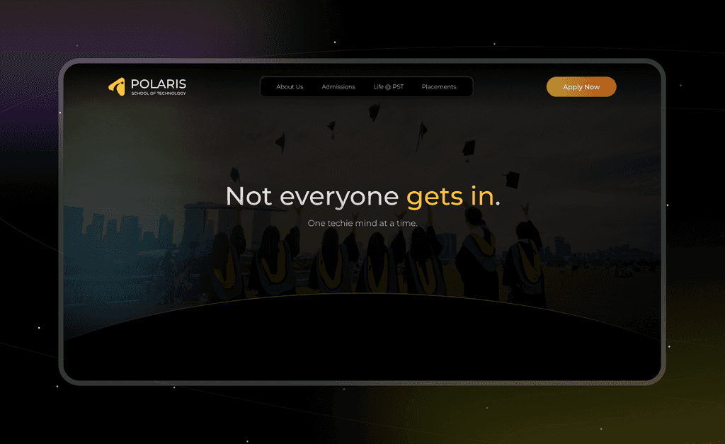 This top section sets an exclusive tone with the statement, โNot everyone gets in. One techie mind at a time,โ immediately highlighting Polarisโs selective approach. A backdrop of graduates underscores the prestige and achievement awaiting those who qualify. The โApply Nowโ button provides a direct path for ambitious students ready to take the next step, reinforcing Polarisโs commitment to individual growth and cutting-edge tech education.