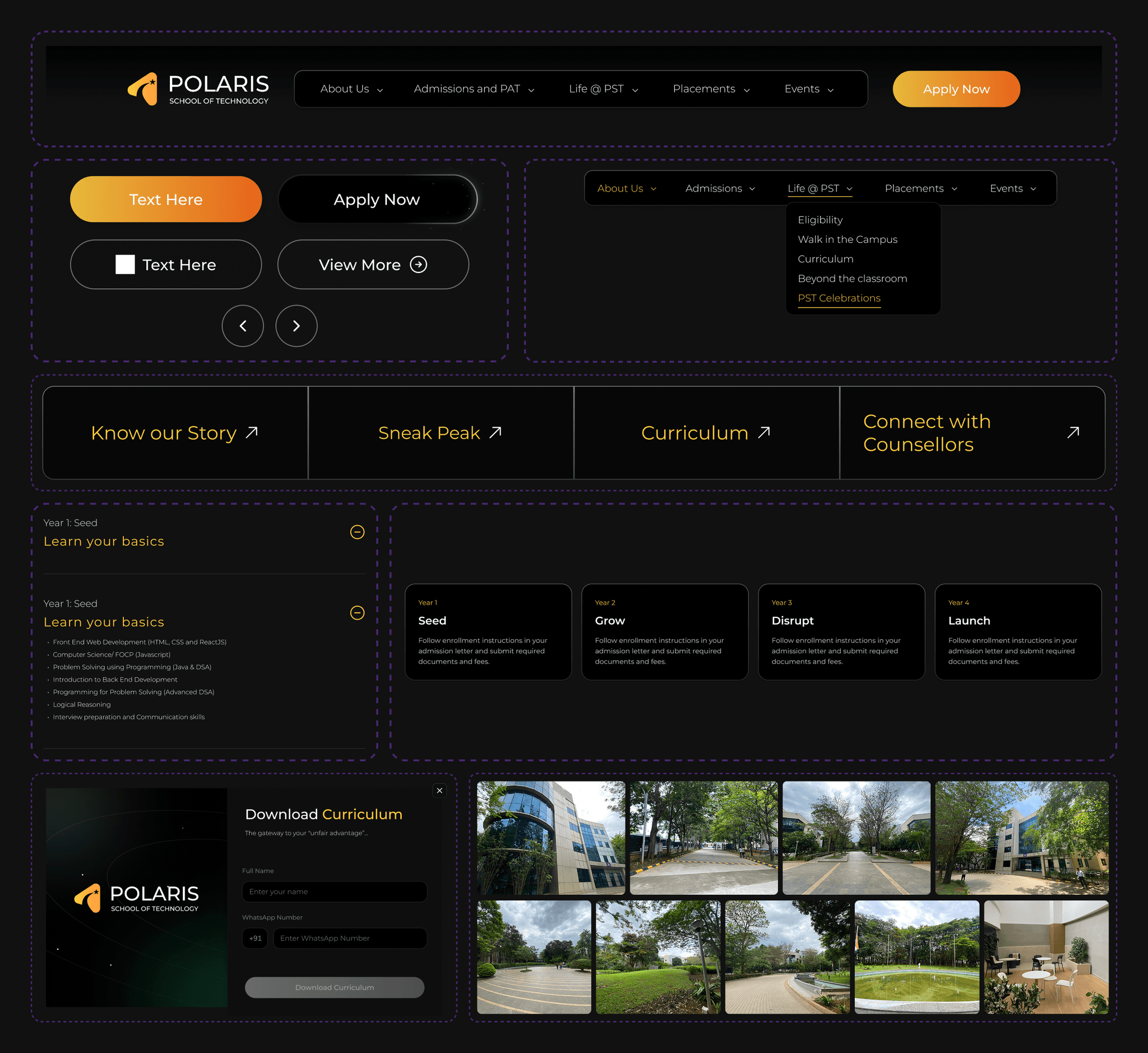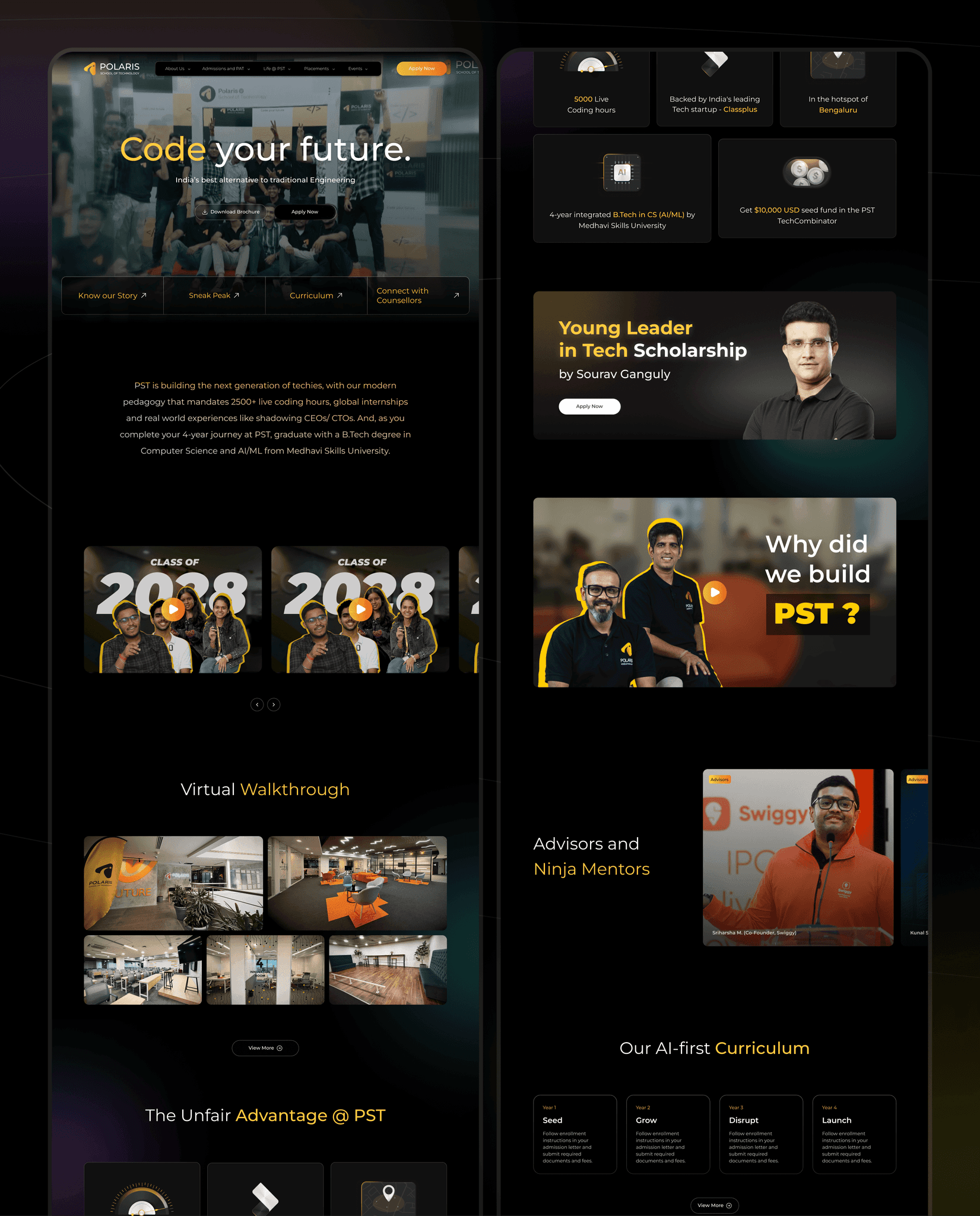 The home page creates a bold first impression, featuring a dynamic hero section with a prominent โCode your futureโ message and an immersive background video. Key highlightsโlike the virtual walkthrough, advantages of PST, and notable alumniโare arranged in a scrollable format, guiding visitors through the institutionโs core benefits. Clear calls to action (e.g., โDownload Brochure,โ โApply Nowโ) encourage immediate engagement, while visually appealing sections showcase the hands-on curriculum, student success stories, and the unique campus experience.