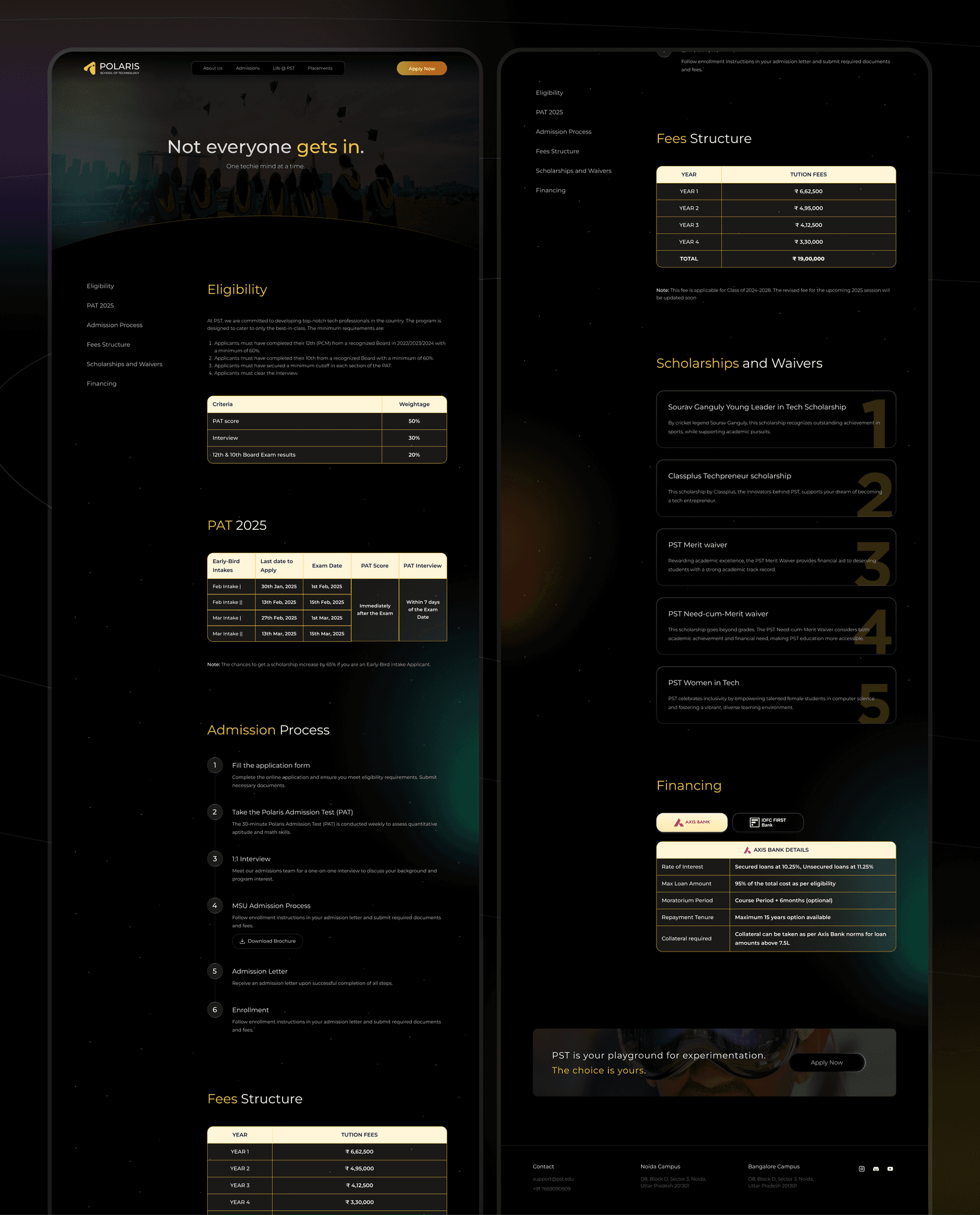 This page emphasizes Polarisโs selective admissions process with a bold taglineโโNot everyone gets in.โ It guides prospective students through key steps: starting with eligibility requirements, then detailing the PAT 2025 admission test, followed by a step-by-step admission process. The page clearly outlines the fee structure, highlights scholarships and waivers, and concludes with financing options. The layout is streamlined for quick reference, ensuring students can easily find all relevant information needed to apply.
